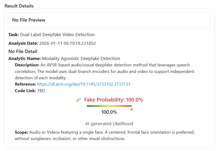 قامت وكالة فرانس برس بتشغيل المقطع عبر أداة DeepFake-o-meter التي طورتها جامعة بوفالو والتي وجدت أنه من المحتمل بنسبة 100% أن يكون من إنتاج الذكاء الاصطناعي (رابط مؤرشف).
