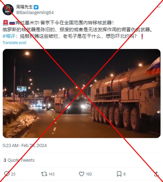 “أمر فلاديمير بوتين بنقل الأسلحة النووية على مستوى البلاد!” اقرأ التسمية التوضيحية الصينية المبسطة لمقطع فيديو على X تمت مشاركته في 29 فبراير 2024.