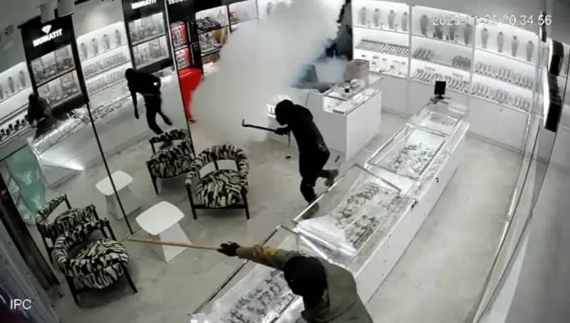 حاول لصوص ملثمون سرقة محل مجوهرات في مركز تجاري في أوفاكيم مساء الثلاثاء، وحطموا واجهات العرض، لكنهم لاذوا بالفرار بعد أن قام أحد موظفي المتجر برشهم برذاذ الفلفل.