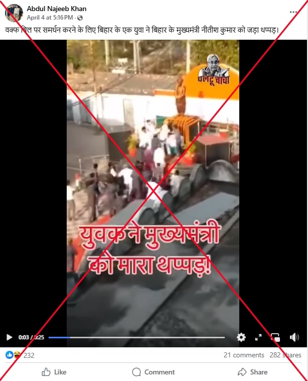 “شاب من بيهار صفع CM NITISH KUMAR لدعمه مشروع قانون الوقف” ، كما يقرأ التسمية التوضيحية باللغة الهندية إلى الفيديو المشترك على Facebook في 4 أبريل 2025.