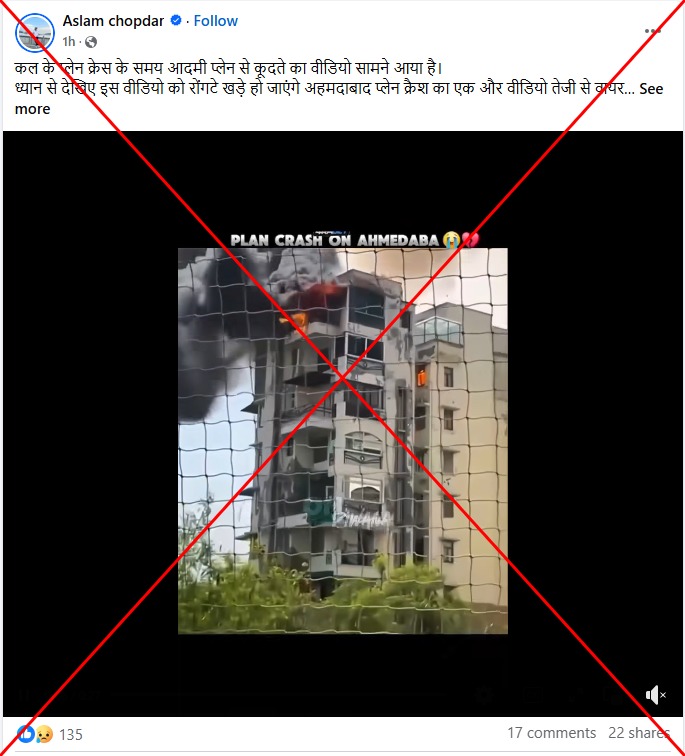 بعد أن اصطدمت طائرة راكب في لندن في حي سكني في مدينة أحمد آباد الهندية ، شارك مستخدمو وسائل التواصل الاجتماعي مقطع فيديو زوايا يزعم أنه يظهر رجلاً يقفز من الطائرة. لكن الفيديو يعرض بالفعل حريقًا في دلهي في 10 يونيو 2025.
