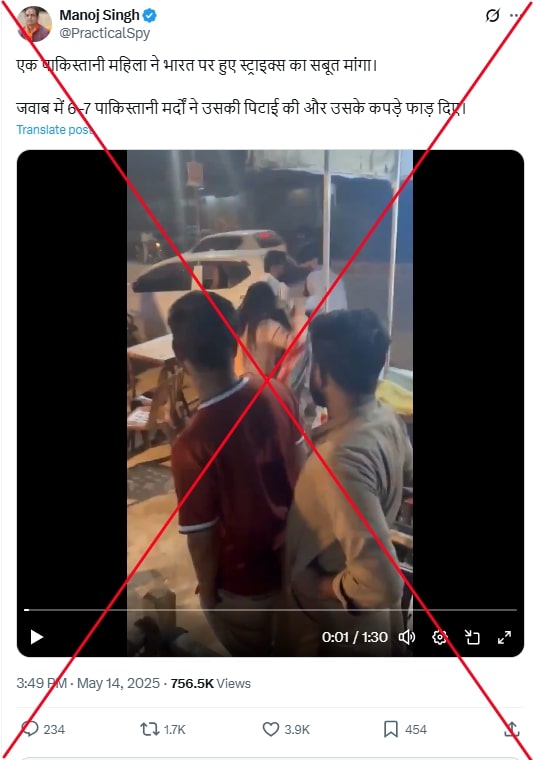 “لقد طلبت امرأة باكستانية إثبات الإضرابات على الهند. رداً على ذلك ، ضربها الرجال الباكستانيون ومزدوا ملابسها” ، كما تقول وظيفة X باللغة الهندية في 14 مايو 2025.