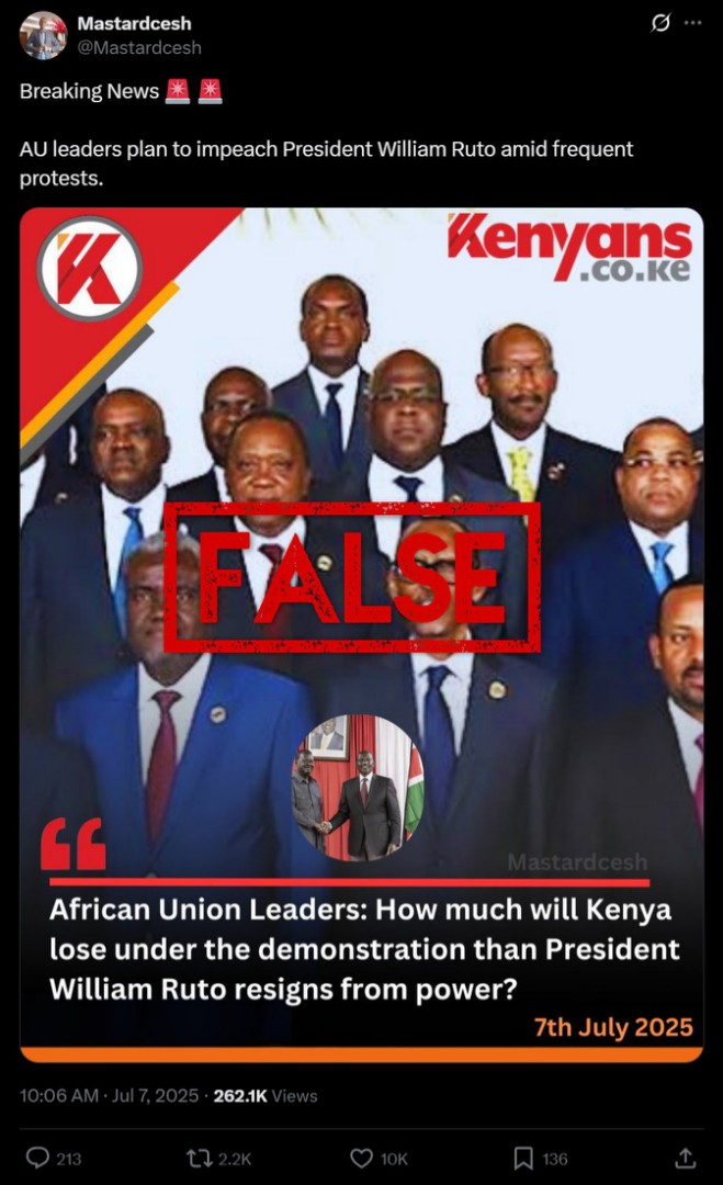 في 7 يونيو 2025 ، كانت كينيا تحمل علامة 35 عامًا على الاحتجاجات المؤيدة للديمقراطية المؤيدة للديمقراطية لعام 1990 والتي دفعت إلى حد ما إلى دولة واحدة ، لكن اليوم كان يشوبه العنف في جميع أنحاء البلاد. جنبا إلى جنب مع الاضطرابات ، شاركت منشورات وسائل التواصل الاجتماعي رسمًا ويدعي أن الاتحاد الأفريقي (AU) يخطط لإقالة الرئيس ويليام روتو. لكن هذا خطأ. يتم تصنيع الرسم الذي ينسب إلى منفذ إخباري محلي ، ولم يعلن الاتحاد الأفريقي عن مثل هذه النوايا ، كما أنه ليس لديه القدرة على القيام بذلك.