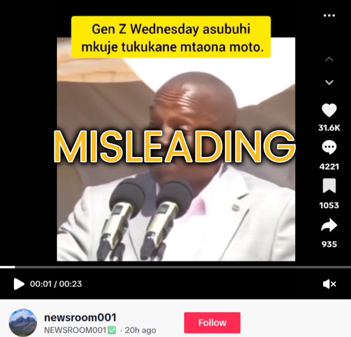يُظهر المقطع أن Kindiki يعطي تحذيرًا: “أسمع أن هناك أشخاصًا يعطون العديد من القصص هناك حول ما سيفعلونه يوم الأربعاء. تعال في الصباح وقابلنا”.
