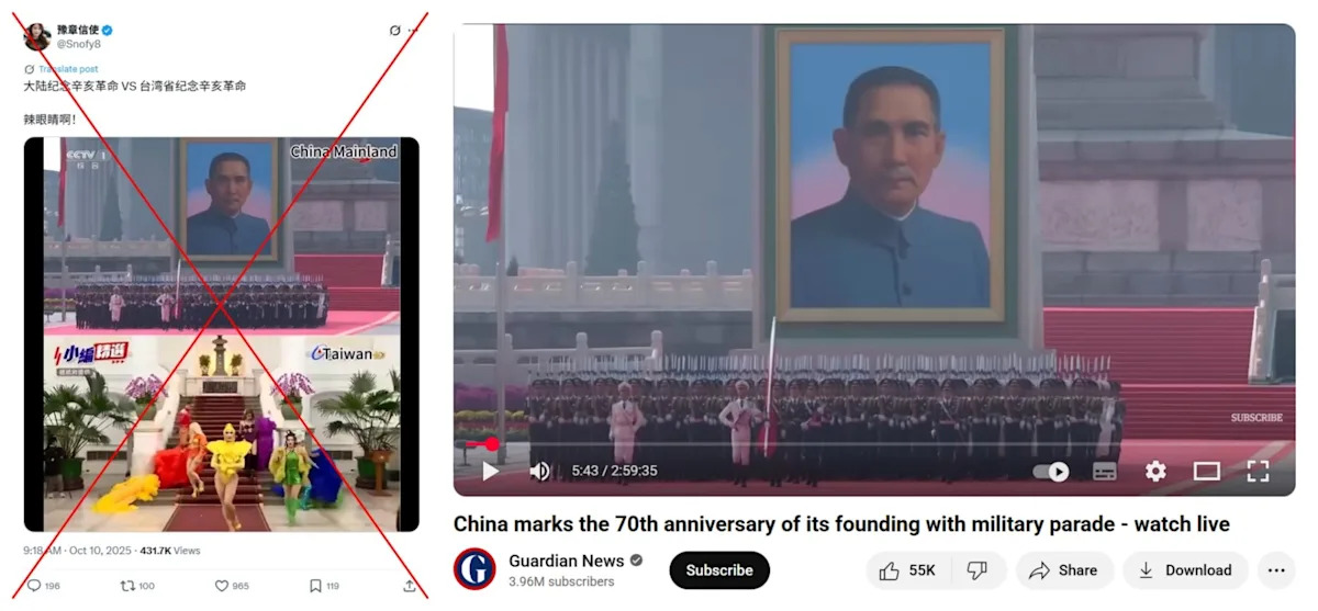 بينما احتفلت تايوان بيومها الوطني في 10 أكتوبر، تم تداول منشورات على وسائل التواصل الاجتماعي وأظهرت لقطات تزعم كذبا أنها أظهرت كيف احتفلت الصين وتايوان بثورة أطاحت بالسلالة الإمبراطورية الصينية قبل أكثر من قرن من الزمان. تصور المقاطع في الواقع موكبًا لليوم الوطني في بكين في عام 2019 وأداء ملكة السحب في تايبيه في عام 2024.