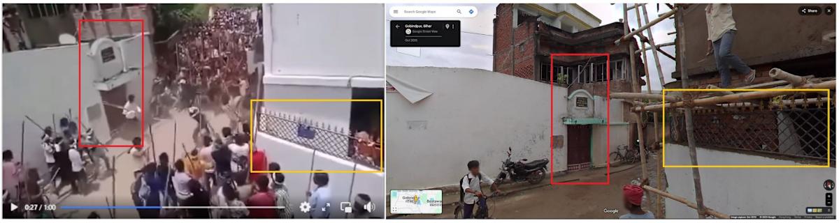 مقارنة لقطات الشاشة للمقطع المشترك في المشاركات الخاطئة (L) وصور Google Street View في المنطقة مع أوجه التشابه التي تميزها فرانس برس