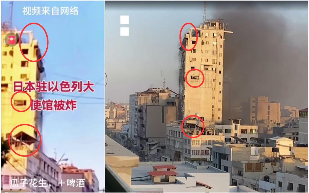 انتشرت على مواقع التواصل الاجتماعي الصينية لقطات لغارة جوية إسرائيلية على مبنى في غزة، زعمت كذبًا أنها تظهر السفارة اليابانية في مدينة تل أبيب الساحلية الإسرائيلية وهي تتعرض لـ”القصف”. ولم ترد أي تقارير رسمية عن تعرض السفارة اليابانية في إسرائيل للهجوم، كما انتشرت منذ مايو/أيار 2021 لقطات مماثلة لتدمير برج غزة في غارة جوية إسرائيلية.
