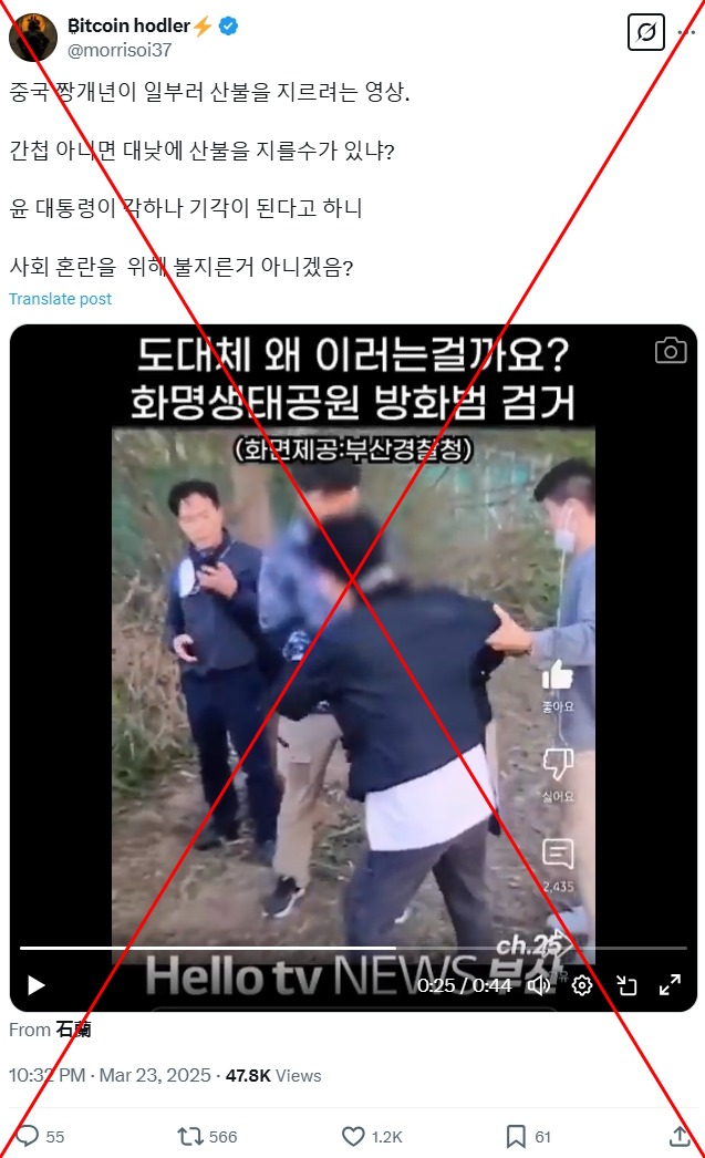 بينما اشتبكت كوريا الجنوبية حرائق غير مسبوقة والتي دمرت مساحات كبيرة من جنوب شرق البلاد في مارس 2025 ، تمت مشاركة مقطع فيديو في مواقع التواصل الاجتماعي زعمت زوراً أنها أظهرت امرأة صينية بدأت واحدة من النيران القاتلة. في الواقع ، تم توزيع الفيديو منذ أكتوبر 2022 في تقارير حول إلقاء القبض على امرأة للاشتباه في حرق العمدة في إحدى الحواس في بوسان. تقول تقارير إخبارية محلية من الوقت إنها حصلت على عقوبة السجن مع وقف التنفيذ.