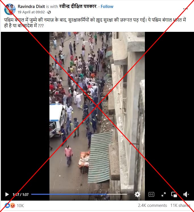 “بعد صلاة الجمعة في البنغال الغربية ، يحتاج أفراد الأمن أنفسهم إلى الحماية” ، كما يقرأ التسمية التوضيحية باللغة الهندية لمقطع فيديو مشترك على Facebook في 19 أبريل 2025.