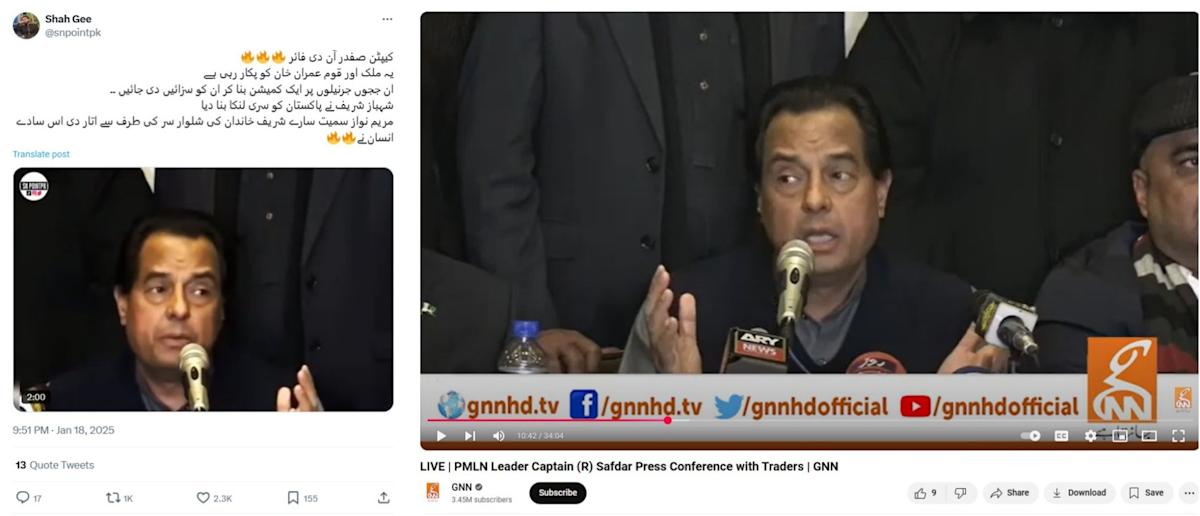 شوهد Safdar وهو يرتدي ملابس مماثلة في فيديو GNN وفي الفيديو المتغير ، والذي تم اقتصاصه وعكسه.