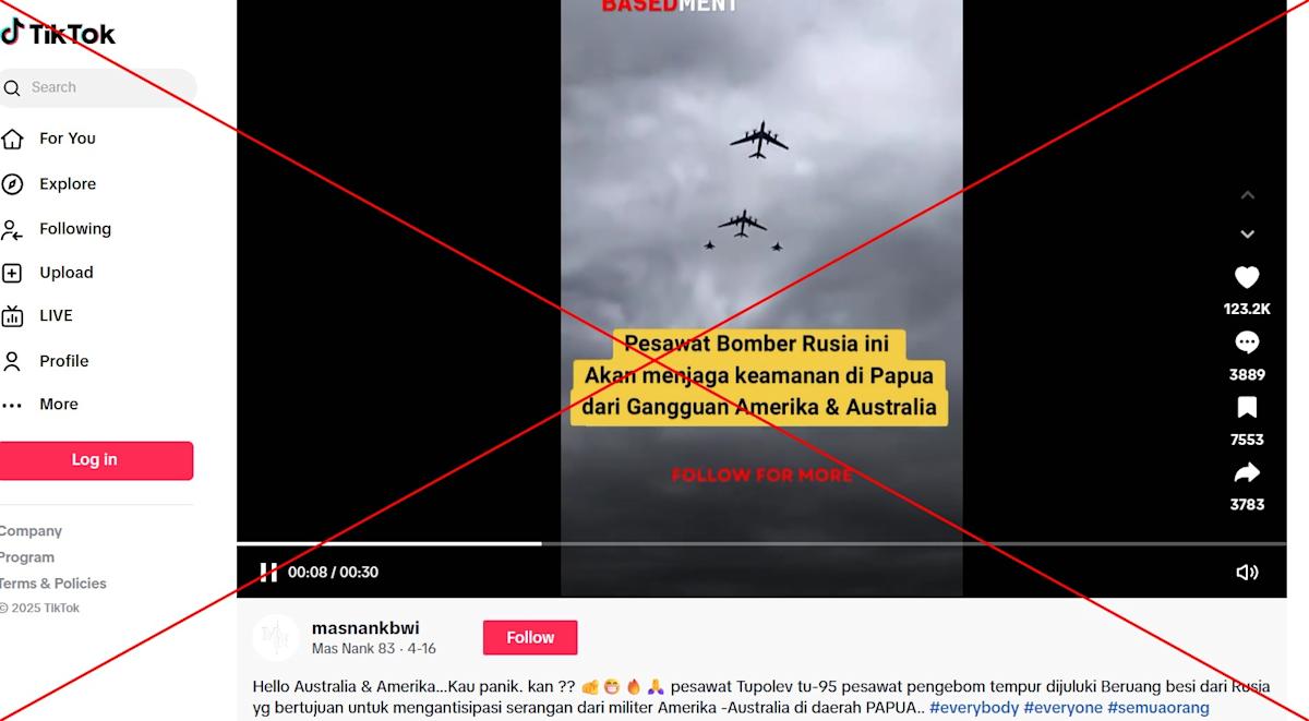 يقول نص اللغة الإندونيسية المتراكبة في فيديو Tiktok في 16 أبريل 2025: “وصول Jets Russian Bomber Jets في إندونيسيا”. “سيحافظ هؤلاء القاذفات الروسية على الأمن في بابوا من التدخل من قبل أمريكا وأستراليا.”