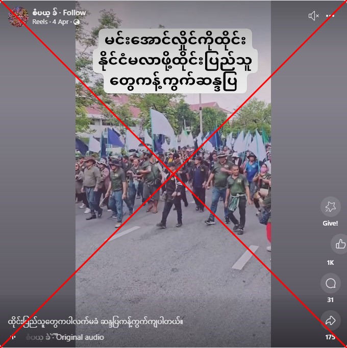 “يحتج الأشخاص التايلانديون على زيارة مين أونغ هلينغ إلى تايلاند” ، كما يقرأ نص باللغة التايلاندية المتراكبة إلى الفيديو المشترك في 4 أبريل 2025 على Facebook.