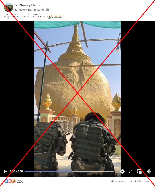 ومع استمرار الصراع بين الجيش والجماعات المسلحة المختلفة في تعكير صفو ميانمار ذات الأغلبية البوذية، تمت مشاركة مقطع فيديو لمقاتلين مؤيدين للديمقراطية إلى جانب ادعاء كاذب بأنهم وصلوا إلى موقع عبادة مقدس يسمى معبد الصخرة الذهبية. لكن القرائن المرئية تظهر أن الباغودا مجرد نسخة طبق الأصل تم العثور عليها في منطقة ماجواي بوسط البلاد وليست الأصلية الموجودة في ولاية مون الشرقية.