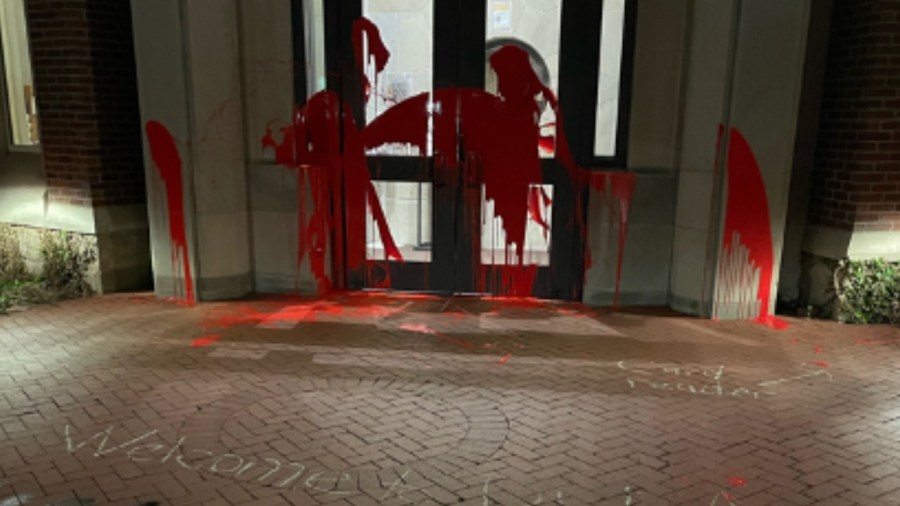 وتضمنت رسالة البريد الإلكتروني صورة تظهر أبواب المبنى المبني من الطوب وبعض واجهاته الحجرية المغطاة بالطلاء الأحمر. ما يبدو أنه كتابة مرسومة بالرش على الممر المبني من الطوب يدلي بملاحظة مهينة ضد شركة تصنيع الأسلحة لوكهيد مارتن.