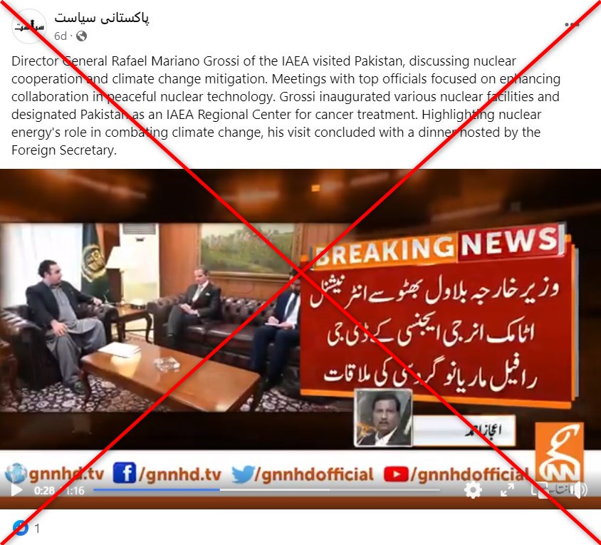 عاد تقرير إخباري قديم عن زيارة رئيس الوكالة الدولية للطاقة الذرية لباكستان، الدولة المسلحة نوويًا والتي يبلغ عدد سكانها 240 مليون نسمة، إلى الظهور من جديد في منشورات مضللة على الإنترنت. تم بث مقطع الفيديو للمدير العام للوكالة الدولية للطاقة الذرية رافائيل ماريانو غروسي – والذي تضمن لافتة “أخبار عاجلة” – في الأصل من قبل منفذ إخباري محلي في عام 2023. وردًا على المنشورات، قالت وزارة الخارجية الباكستانية إنه لم يقم بزيارة الدولة الواقعة في جنوب آسيا. في مارس 2024.