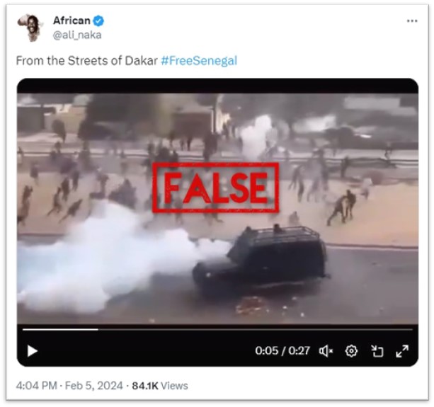 ودخلت السنغال في أزمة بعد أن دعم البرلمان الرئيس ماكي سالقرار بتأجيل الانتخابات 10 أشهر. وأثارت هذه الخطوة قلقا دوليا بشأن احتمال تراجع الديمقراطية في بلد يُنظر إليه عادة على أنه منارة للاستقرار في غرب أفريقيا. شارك مستخدمون في نيجيريا مقطع فيديو يزعم أنه يظهر اشتباكات عنيفة في العاصمة السنغالية داكار، بعد تأجيل التصويت. لكن هذا الادعاء كاذب: على الرغم من أن اللقطات تظهر الاضطرابات في داكار، إلا أنها موجودة على الإنترنت منذ مارس 2023 على الأقل.