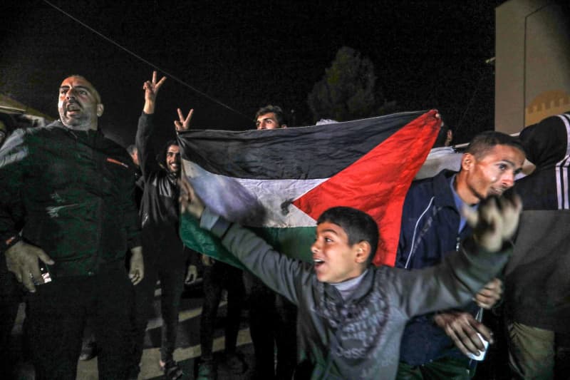 الفلسطينيون يحتفلون بعد أنباء التوصل إلى اتفاق لوقف إطلاق النار مع إسرائيل. أعلنت قطر الوسيط أن إسرائيل وحركة المقاومة الإسلامية (حماس) اتفقتا على وقف إطلاق النار في قطاع غزة وإطلاق سراح المزيد من الرهائن مقابل إطلاق سراح سجناء فلسطينيين. عمر أشتاوي/APA الصور عبر ZUMA Press Wire/dpa