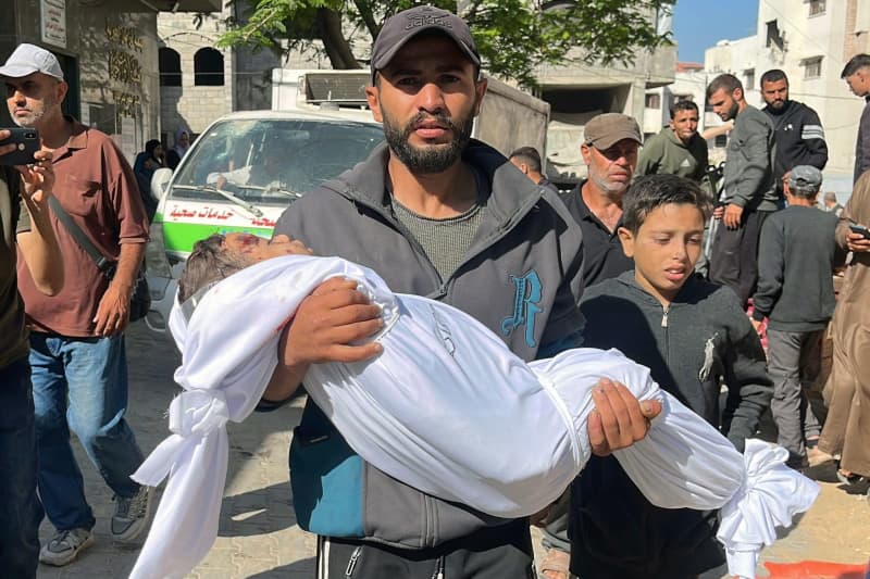 أقارب الفلسطينيين الذين فقدوا حياتهم بعد أن قصف الجيش الإسرائيلي العديد من المنازل في غزة ، يتم نقل جثث الفلسطينيين الذين فقدوا حياتهم في الهجوم إلى مستشفى الشيفا في مدينة غزة. Hadi Daoud/APA صور عبر Zuma Press Wire/DPA