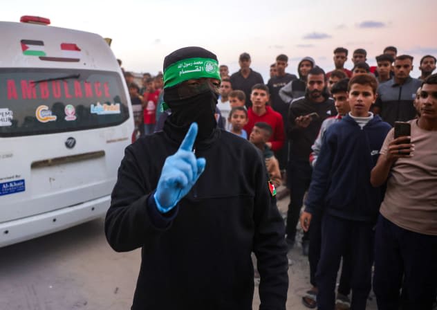 حركة إرهابية من حركة حماس بينما يتجمع الناس حول سيارة إسعاف تحمل جثة تم انتشالها من نفق في منطقة شمال خان يونس في جنوب قطاع غزة، 28 أكتوبر، 2025. (مصدر الصورة: BASHAR TALEB/AFP VIA GETTY IMAGES)