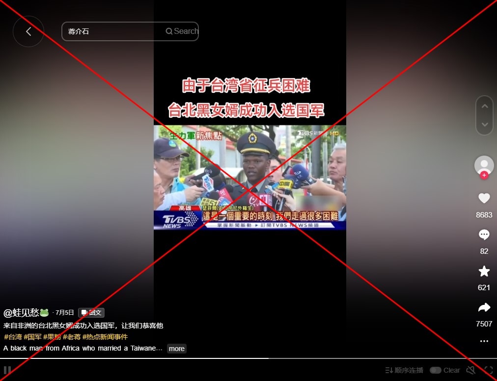 يشارك The Douyin Post المنشور في 5 يوليو 2025 صورة مأخوذة من تقرير من TVBs المذيع يعرض رجلًا أسود في زي عسكري تايواني.