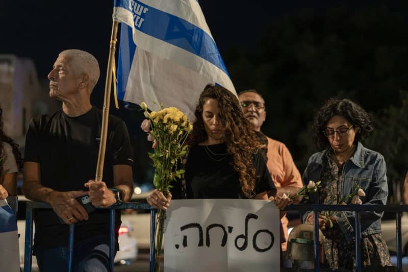 الناس يقدمون احترامهم خارج معهد أبو كبير للطب الشرعي مع وصول جثث الرهائن الأربعة، دانييل بيريتس، ​​ويوسي شرابي، وغي إيلوز، والمواطن النيبالي بيبين جوشي، من غزة، وسط وقف إطلاق النار بين إسرائيل وحماس. إيليا يفيموفيتش/ وكالة الأنباء الألمانية