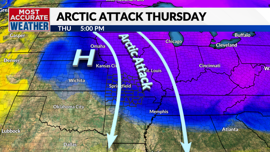 تصل الجبهة القطبية الشمالية قرب منتصف الليل مع رياح عاصفة وانخفاض درجات الحرارة. بحلول الصباح، ستكون القراءات في سن المراهقة العليا وفي العشرينات من العمر مع قشعريرة رياح تصل إلى أرقام فردية. لن يهدأ البرد خلال النهار مع قراءات بعد الظهر أقل من درجة التجمد في معظم أنحاء الأوزاركس.