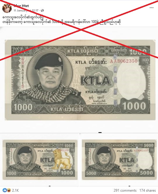 المتحدث باسم KTLA الكابتن سو نيي زاو وقالوا لوكالة فرانس برس في 15 كانون الثاني/يناير إنهم لم يصدروا مثل هذه الأوراق النقدية، ولم يتمكنوا من التعرف على النص المطبوع عليها.