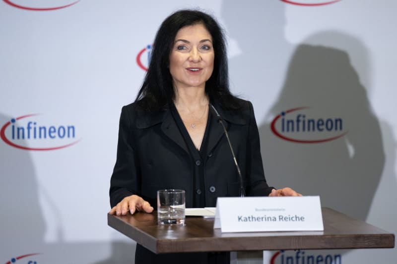 تتحدث كاثرينا رايش ، وزيرة الشؤون الاقتصادية والطاقة الألمانية ، في مؤتمر صحفي في مصنع إنفينينون للرقائق. هذه المناسبة هي سلسلة من الزيارات الصيفية من قبل الوزير للشركات والشركات الحرفية في ألمانيا. سيباستيان كانيرت/DPA