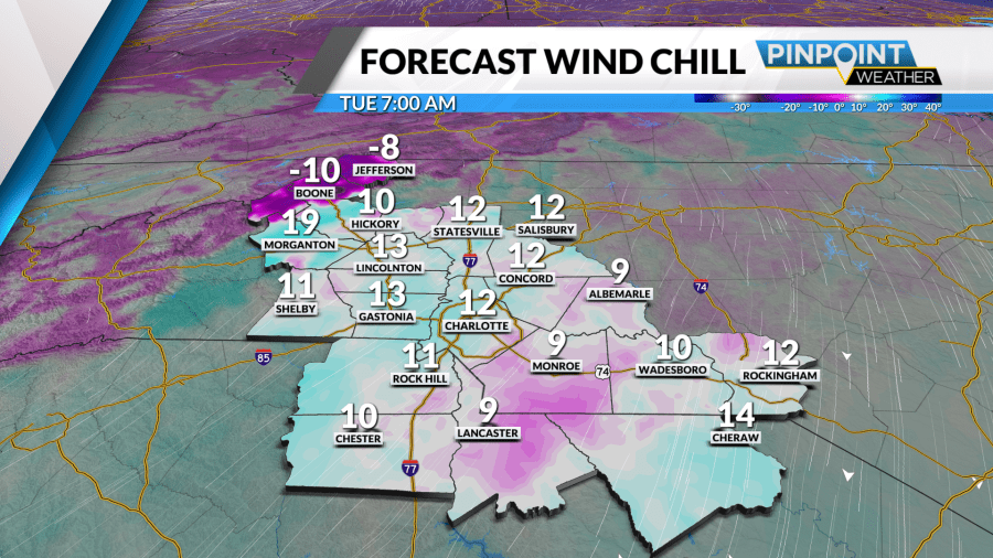 فرصة هطول درجات حرارة دون التجمد مرتفعة، لكن فرصة تساقط الثلوج منخفضة في منطقتنا يوم الثلاثاء. في حين أن المناطق في كارولينا الشرقية يمكن أن تصل إلى عدة بوصات، فإن بعض منطقتنا لن تشهد سوى غبار يصل إلى بوصة واحدة، وهذا بشكل رئيسي جنوب وشرق شارلوت. من الممكن حدوث هبات في أماكن أخرى. ومع ذلك، مع وجود القليل من الرطوبة ودرجات الحرارة أقل من درجة التجمد، سيتعين علينا مراقبة المناطق الملساء على الطرق التي تتطور مساء الثلاثاء وحتى صباح الأربعاء.