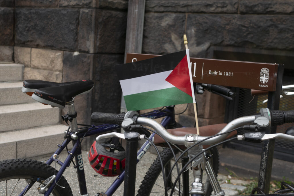 يظهر علم فلسطيني على دراجة خارج قاعة سايلز في جامعة براون في 30 أبريل 2024. (تصوير ألكساندر كاسترو/رود آيلاند تيار)