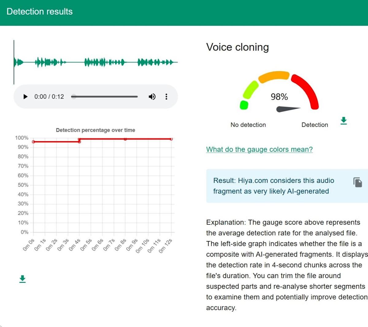 لقطة شاشة لاكتشاف الاستنساخ الصوتي من Invid-Weverify
