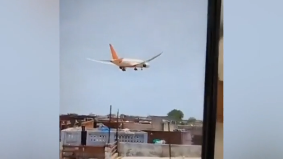 اللحظات السابقة تحطمت طائرة الركاب في طيران الهند في غرب الهند يوم الخميس تم التقاطها في شريط فيديو تم تصويره من مبنى بالقرب من موقع التحطم ، تم التحقق من CBS News.