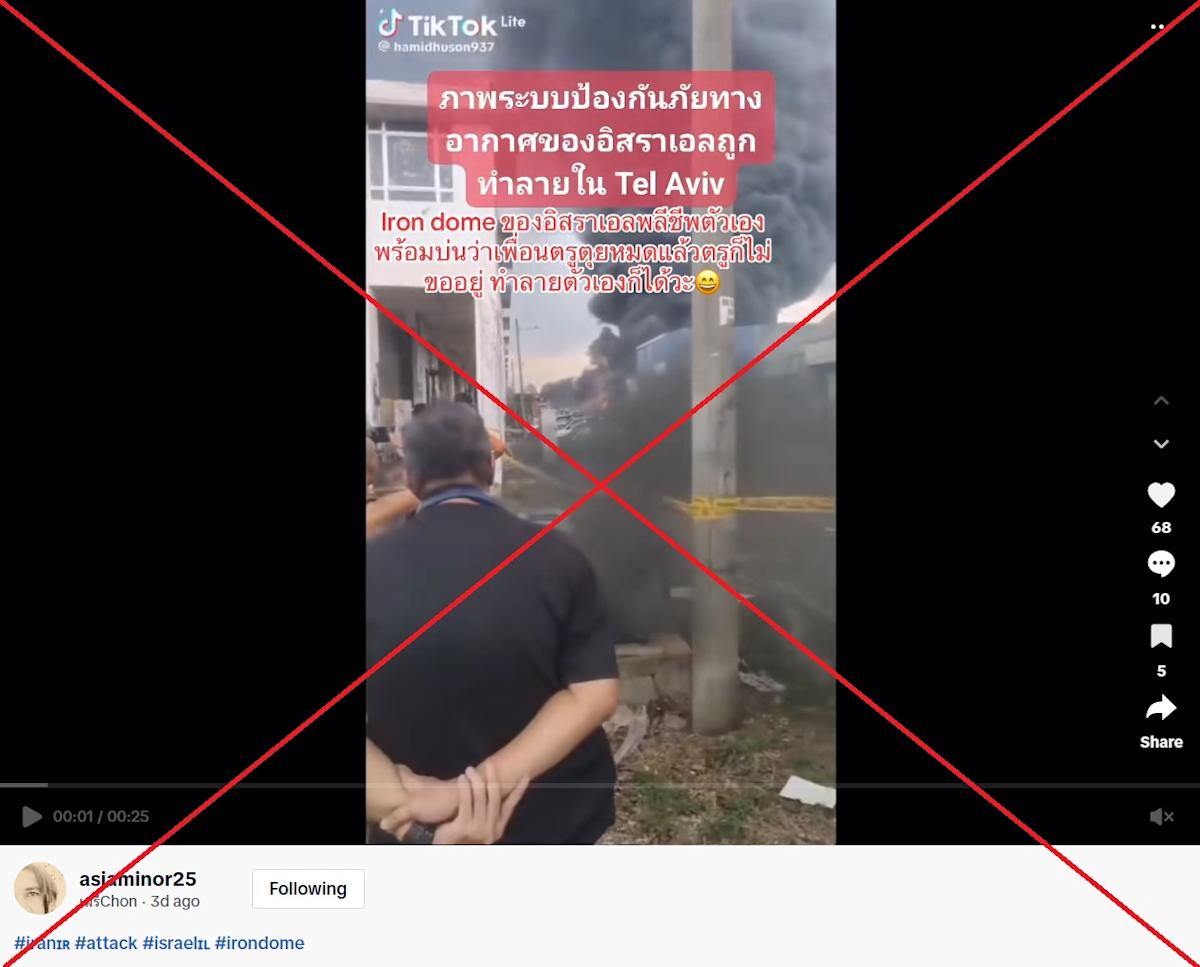 “لقد تم تدمير نظام الدفاع الجوي الإسرائيلي في تل أبيب من قبل الصواريخ الإيرانية” ، كما يقرأ نص باللغة التايلاندية على مقطع فيديو تم نشره في 20 يونيو 2025.