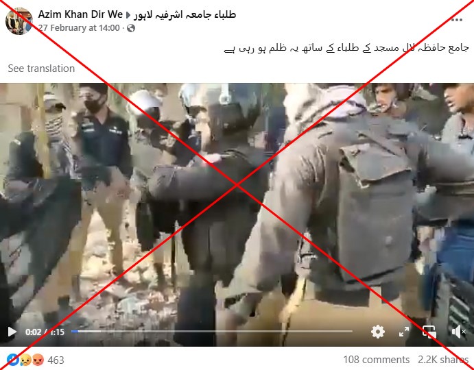“يتم القيام بهذا الظلم لطلاب جاميا حافا ، لال مسجد” ، يقرأ التسمية التوضيحية باللغة الأردية إلى مقطع فيديو على Facebook مشترك في 27 فبراير 2025.