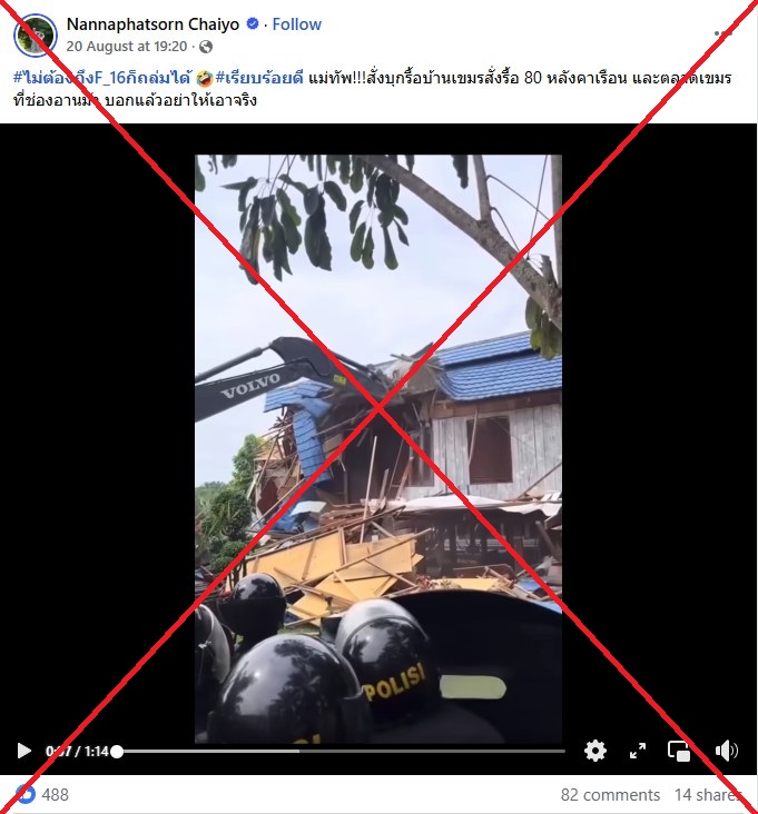 في أعقاب اشتباك مميت بين كمبوديا وتايلاند التي قتلت أكثر من 40 شخصًا ، انقضت لقطات هدم المنزل على وسائل التواصل الاجتماعي مع ادعاء كاذب بأنه يظهر السلطات التايلاندية التي تمزق المنازل الكمبودية في قرية حدودية متنازع عليها. تم تصوير الفيديو الأصلي في مقاطعة شمال سومطرة في إندونيسيا.