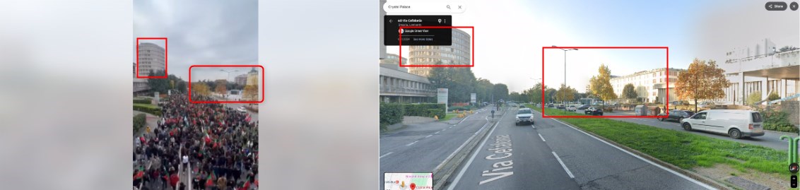 مقارنة لقطة الشاشة للفيديو المشترك زوراً (يسار) وصور Google Street View من Brescia (يمين)