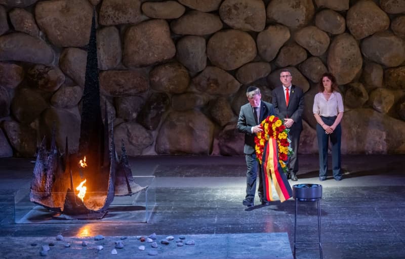 لقد وضع إكليلًا من الزهور في قاعة التذكر للاحتفال بـ 6 ملايين يهودي قتلهم النظام النازي في ألمانيا.