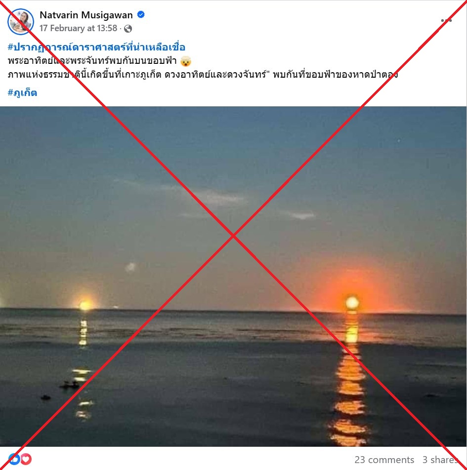 “#UnbelIEVABLEASTROMICALICALICHOMENONON! The Sun and Moon يجتمعان في الأفق” ، يقرأ منشور على Facebook باللغة التايلاندية في 17 فبراير 2025.