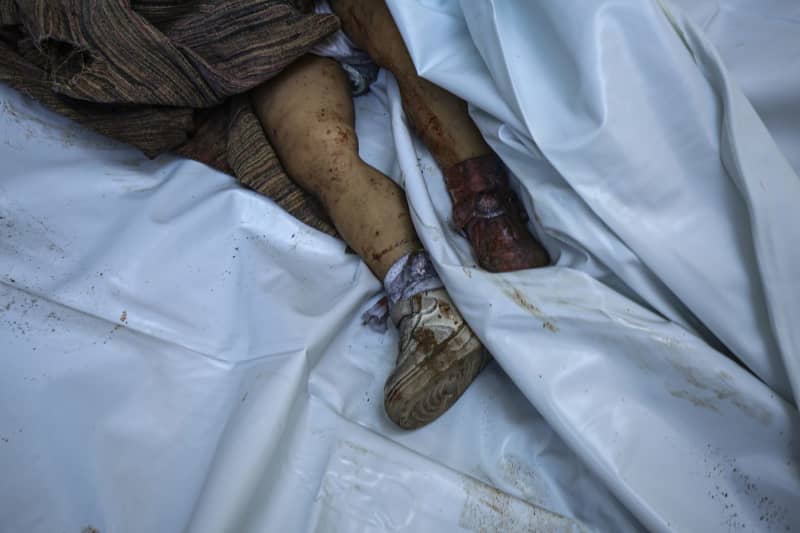 أقارب الفلسطينيين الذين فقدوا حياتهم في تفجير إسرائيلي على شاطئ مدينة غزة ، حدادا على أجسادهم خارج مستشفى الشيفا. عمر Ashtawy/APA عبر Zuma Press Wire/DPA