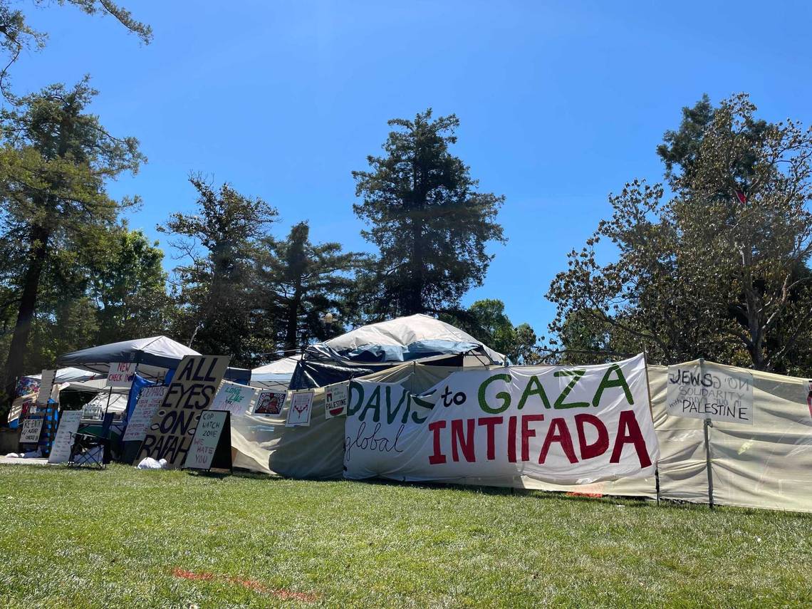قال ماكونيهي إن المعسكر الموجود خارج اتحاد جامعة كاليفورنيا في ديفيس التذكاري بدأ في 6 مايو وشهد مواجهات متعددة مع المتظاهرين المناوئين، بما في ذلك رجل دخل المعسكر ولكم أحد أفراد أمن المعسكر بعد أن احتشد المتظاهرون حوله.
