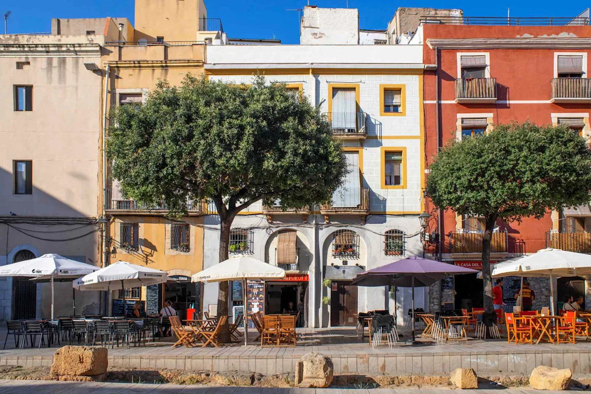 زاوية مطعم خارجي به طاولات ومقاعد فارغة في إسبانيا