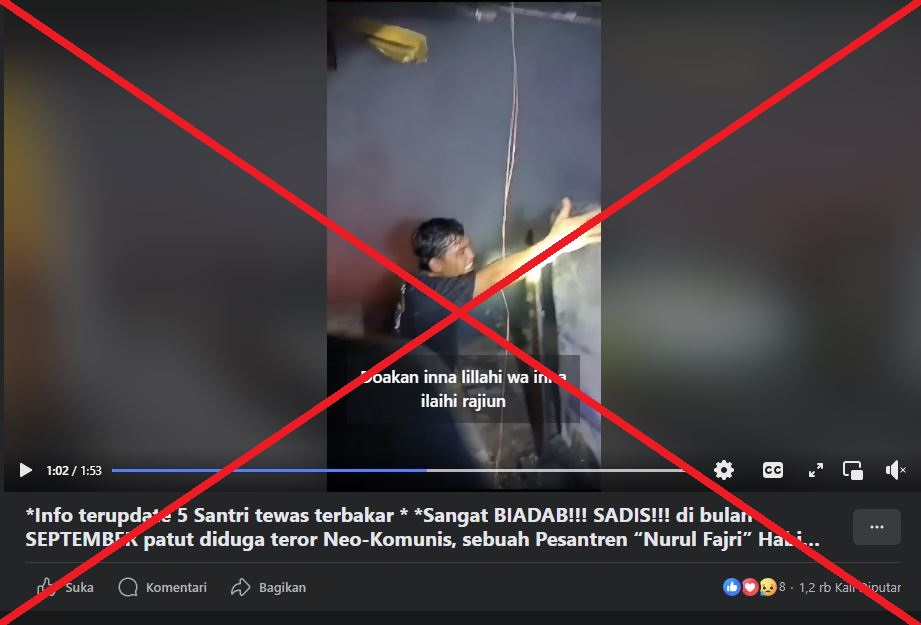 تمت مشاركة مقطع فيديو تم التقاطه بعد حريق في مدرسة داخلية إسلامية في منطقة بوجور بمقاطعة جاوة الغربية الإندونيسية بشكل متكرر إلى جانب ادعاء كاذب بأن الحريق أدى إلى مقتل خمسة طلاب في منطقة سوكابومي في سبتمبر. وقالت الشرطة في بوجور إن الحريق الذي وقع في يوليو/تموز لم يتسبب في أي وفيات، فيما قال متحدث باسم المؤسسة التي تدير المدرسة لوكالة فرانس برس إنهم لا يعملون في سوكابومي.
