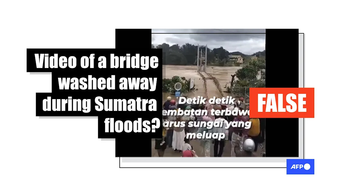 بينما دمرت الفيضانات الجسور في سومطرة، بما في ذلك معبر في سيبولجا لم يتم تسجيل الفيديو المتداول في إندونيسيا (مؤرشف هنا وهنا وهنا).