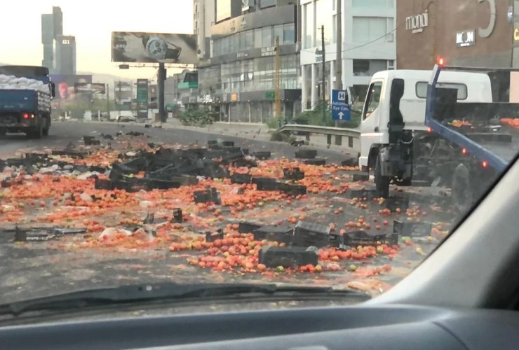 بالصور/ البندورة تُغرق أوتوستراد الضبية بعد حادث تصادم بين بيك آب و سيارة