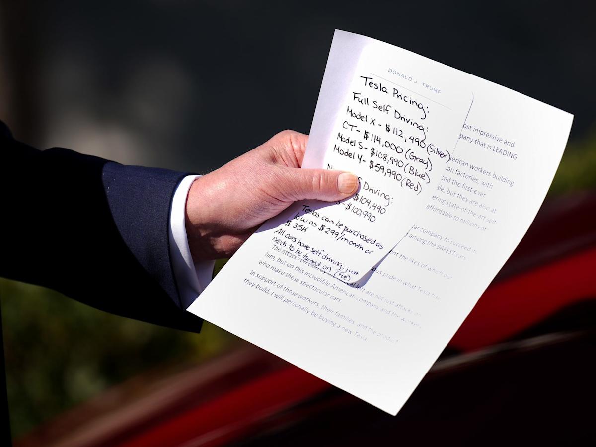 يحمل الرئيس دونالد ترامب ملاحظات مع أسعار تسلا عليها.أندرو هارنيك/غيتي إيموز