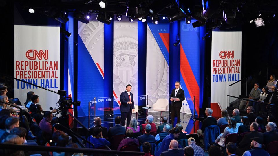حاكم فلوريدا رون ديسانتيس شارك في اجتماع لشبكة سي إن إن يوم الثلاثاء في ولاية أيوا قبل المؤتمرات الحزبية بالولاية الشهر المقبل.