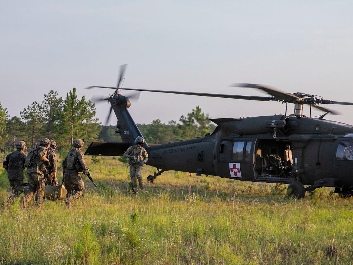 يمارس الجنود نقل ضحية إلى طائرة هليكوبتر بلاك هوك.الرقيب. Tori Miller/124th Mobile Afpairs Slachment