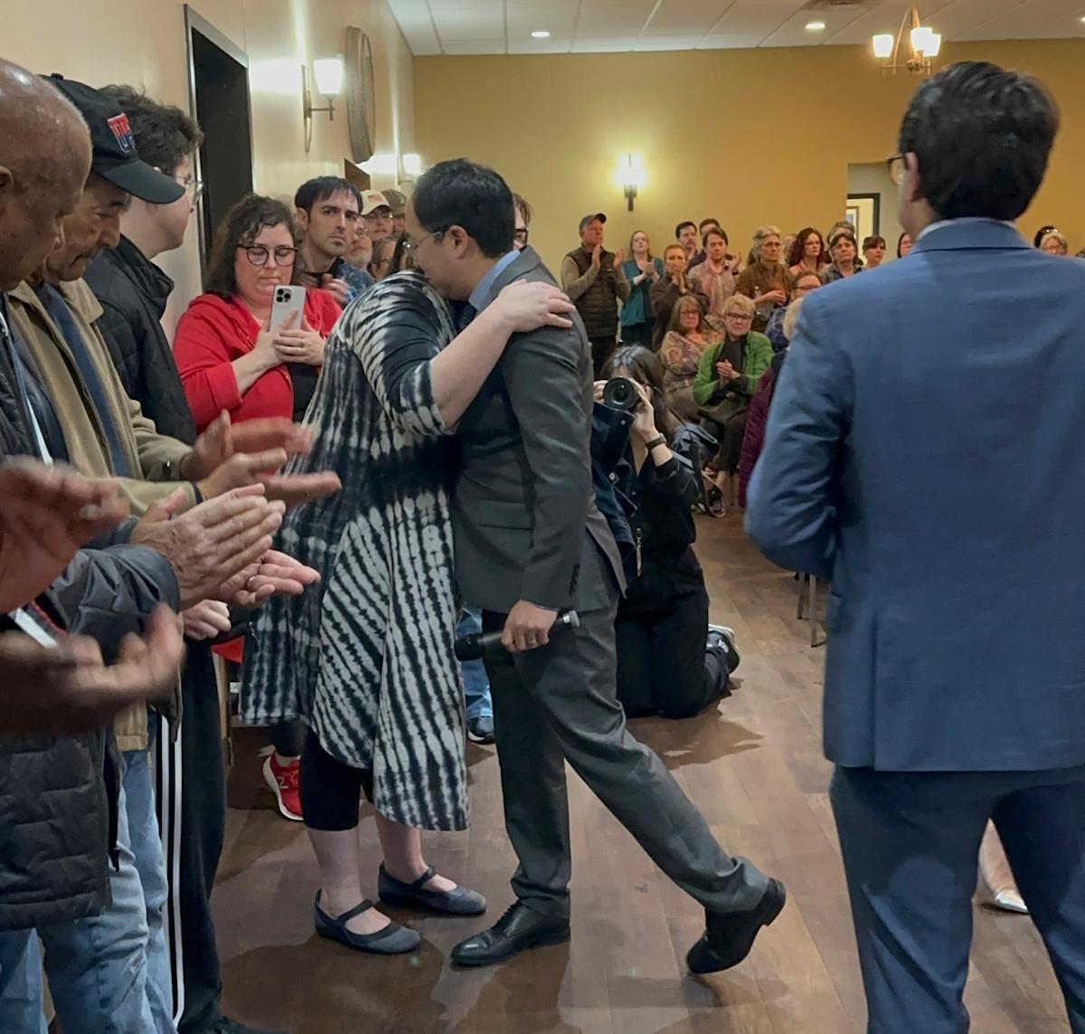 “من فضلك ، أنا فقط-أنا هنا لأقول فقط أرجو أن تبقى منخرطين ، والبقاء معي ، والبقاء مع الآخرين ، وساعدني في محاولة بناء هذا النوع من الحركة التي نحتاج أن نكون قادرين على تعبئتها” ، قال كيم بالقرب من نهاية الساعة و 40 دقيقة من أسئلة وأجوبة في قاعة Union Teamsters.