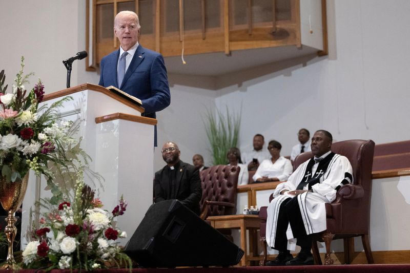 كولومبيا (كارولاينا الجنوبية) (رويترز) – الرئيس جو بايدن تحدث عن عقيدته الدينية في قداس يوم الأحد في كنيسة أمريكية من أصل أفريقي في ولاية كارولينا الجنوبية، حيث يعمل على تعزيز دعم السود الذي من المرجح أن يكون حاسما لفرص إعادة انتخابه في نوفمبر.
