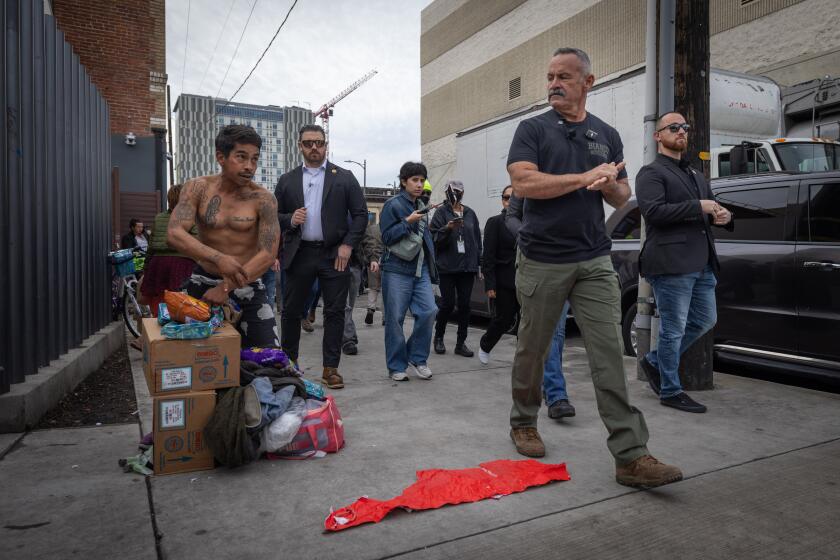 بيانكو وكيت مونرو، الرئيس التنفيذي لشركة VetComm، يتحدثان مع امرأة على الرصيف بينما كانا يتجولان في Skid Row. (جيسون أرموند / لوس أنجلوس تايمز)
